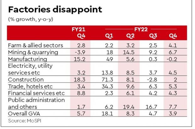 However, a contraction in manufacturing in the fourth quarter of FY22, albeit marginal and on an inconducive base, doesn’t bode well for the promise of a quick and sharp turnaround in private capex. Growth in the manufacturing sector, hit by high input costs, tangled global supply chains and Covid-induced curbs on mobility in the initial months of the last quarter, sink to -0.2%, against 0.3% in the previous quarter.
