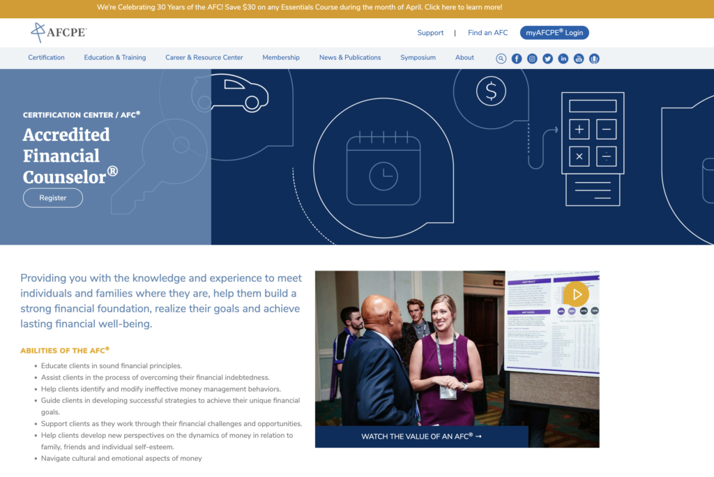 Here is just one of the certifications that you can get from the AFCPE (Accredited Financial Counseling and Planning Education):