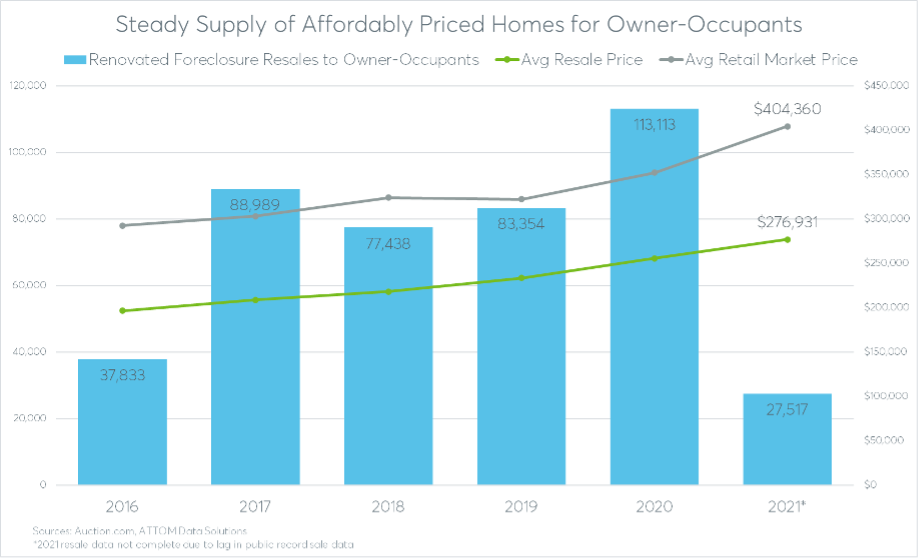 In addition to the estimated 140,000 renovated foreclosures resold to owner-occupants by local community developers like McCormick and Johnson, nearly 24,000 properties were sold directly to owner-occupants at foreclosure auction or REO auction in 2020 and 2021 combined.