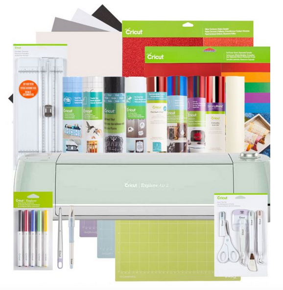 This bundle includes a Cricut Explore Air 2 plus a variety of blades, mats, tools, and materials galore.