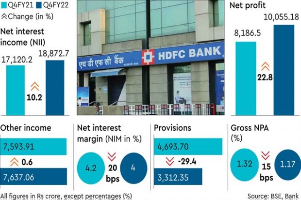 HDFC Bank on Saturday reported a 22.8% year-on-year (y-o-y) growth in net profit for the quarter ended March to Rs 10,055 crore on the back of a 29% y-o-y fall in provisions to Rs 3,312.35 crore.