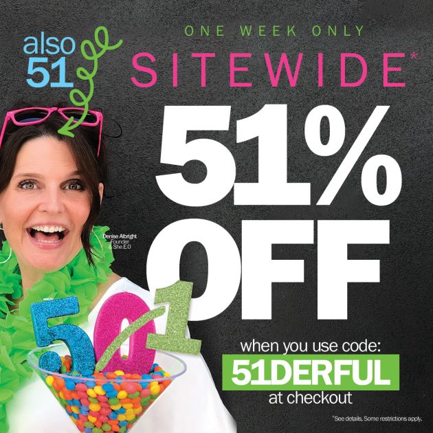 In celebration of Denise’s 51st birthday, you can get an extra 51% off any products site-wide on the Denise Albright site with code 51DERFUL at checkout.