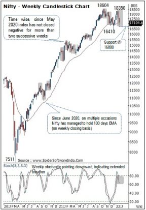Structurally, on multiple occasions Nifty has managed to hold 100 days EMA (on weekly closing basis), since June 2020. In the current scenario as well index is sustaining above it. Thereby, we believe current weeks low of 16800 would act as key support as it coincides with 80% retracement of December-January rally (16410-18350), placed at 16798